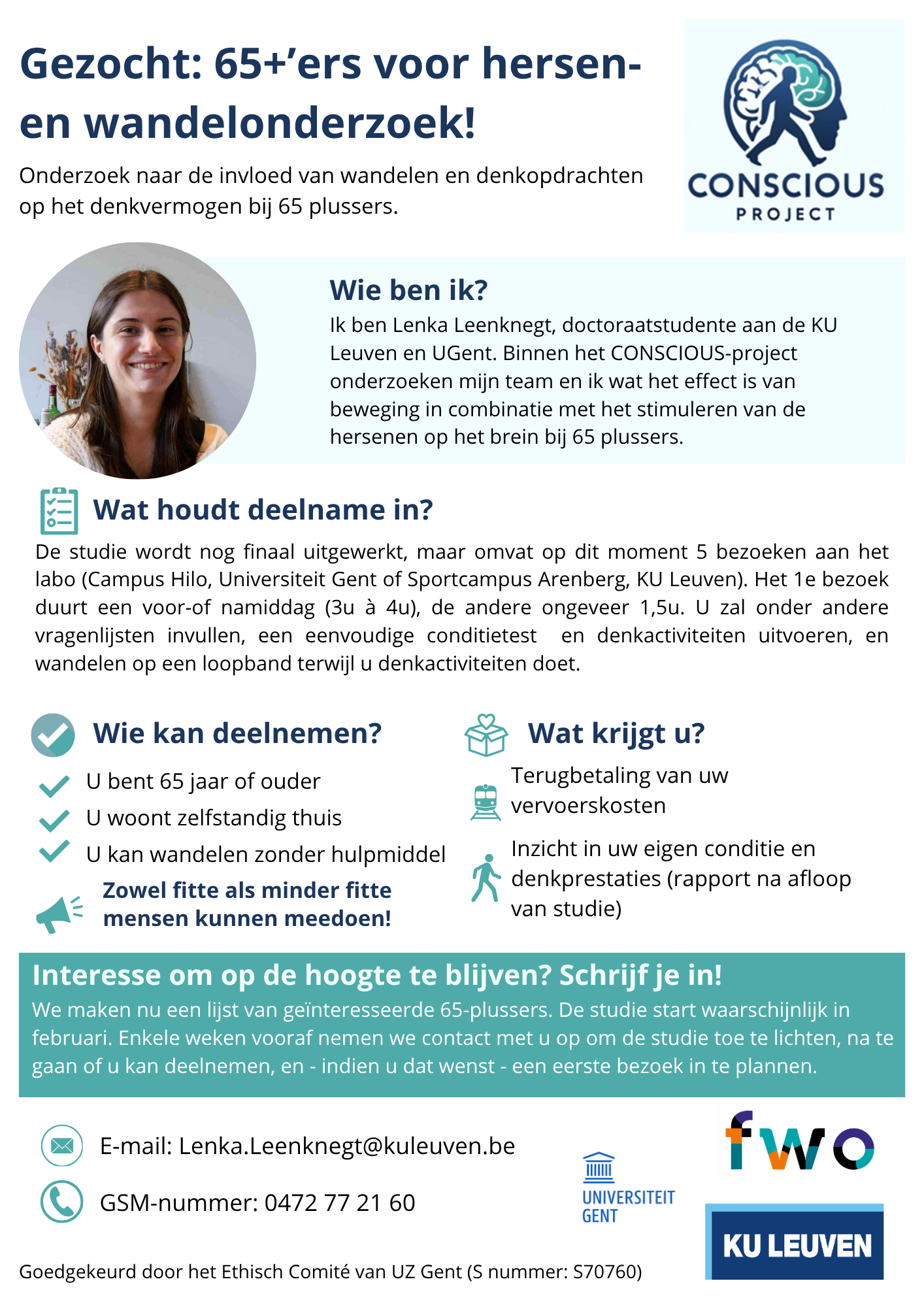 Oproep: ben je 65+, woon je nog thuis, en wil je deelnemen aan hersen- en wandelonderzoek? Neem dan deel aan dit onderzoek. Het CONSCIOUS-project, een samenwerking tussen KU Leuven en UGent, onderzoekt hoe beweging en denkactiviteiten samen de hersenfunctie ondersteunen bij oudere volwassenen. Hiervoor worden nog enthousiaste deelnemers gezocht. Ook 65+’ers met een minder goede conditie worden nadrukkelijk uitgenodigd om deel te nemen!